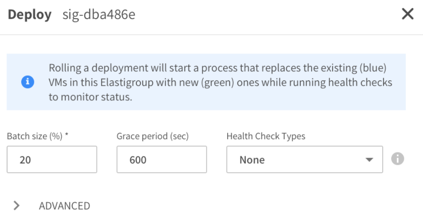 When you roll the deployment, Elastigroup starts a process that replaces the existing (blue) VMs with new (green) ones. The health checks you defined will monitor the status, and a banner will be displayed showing the progress.